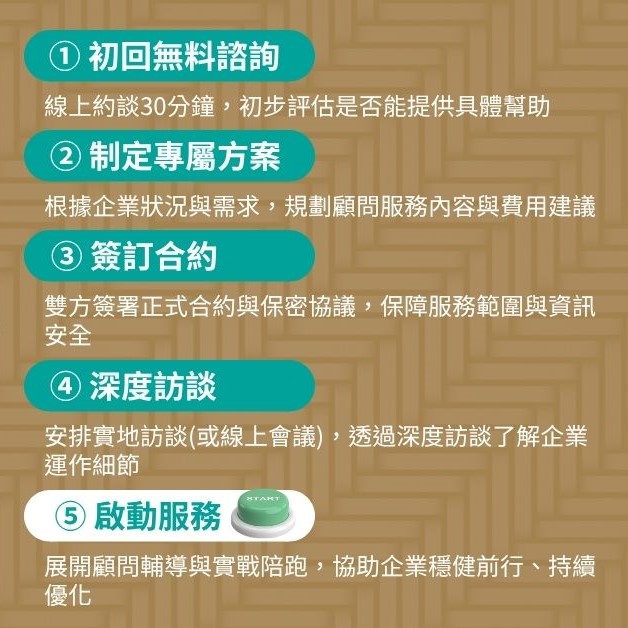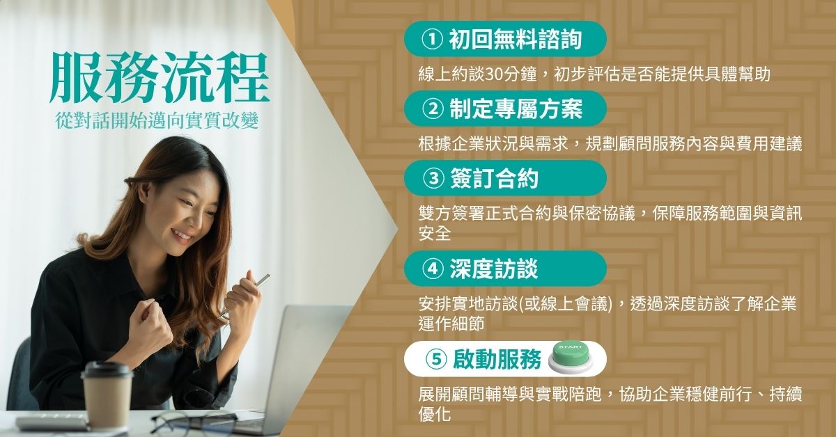 從剛起步的小團隊,到正準備轉型或擴張的企業,許多經營者都曾經歷過這些掙扎與迷惘。真正需要的,從來不是更多艱澀理論或制式建議,而是能站在你立場、陪你與團隊一起拆解問題的實戰型顧問。