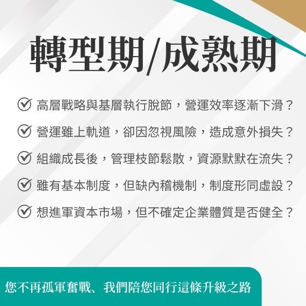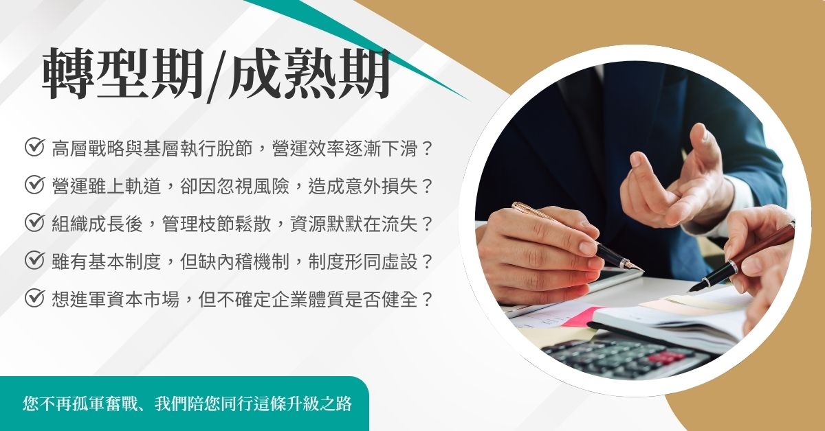 每家公司都不一樣,問題的解方也無法一體適用。我們從企業實際困擾出發,針對當前最困擾的問題,深入釐清根本原因,從治理架構、制度缺口與流程瓶頸,量身提出解方,並陪您一步步落地執行